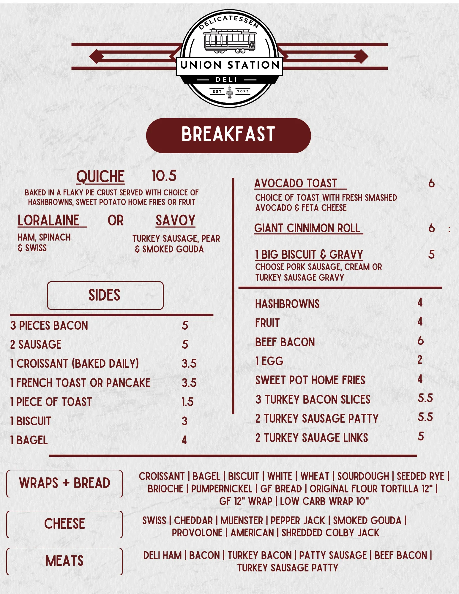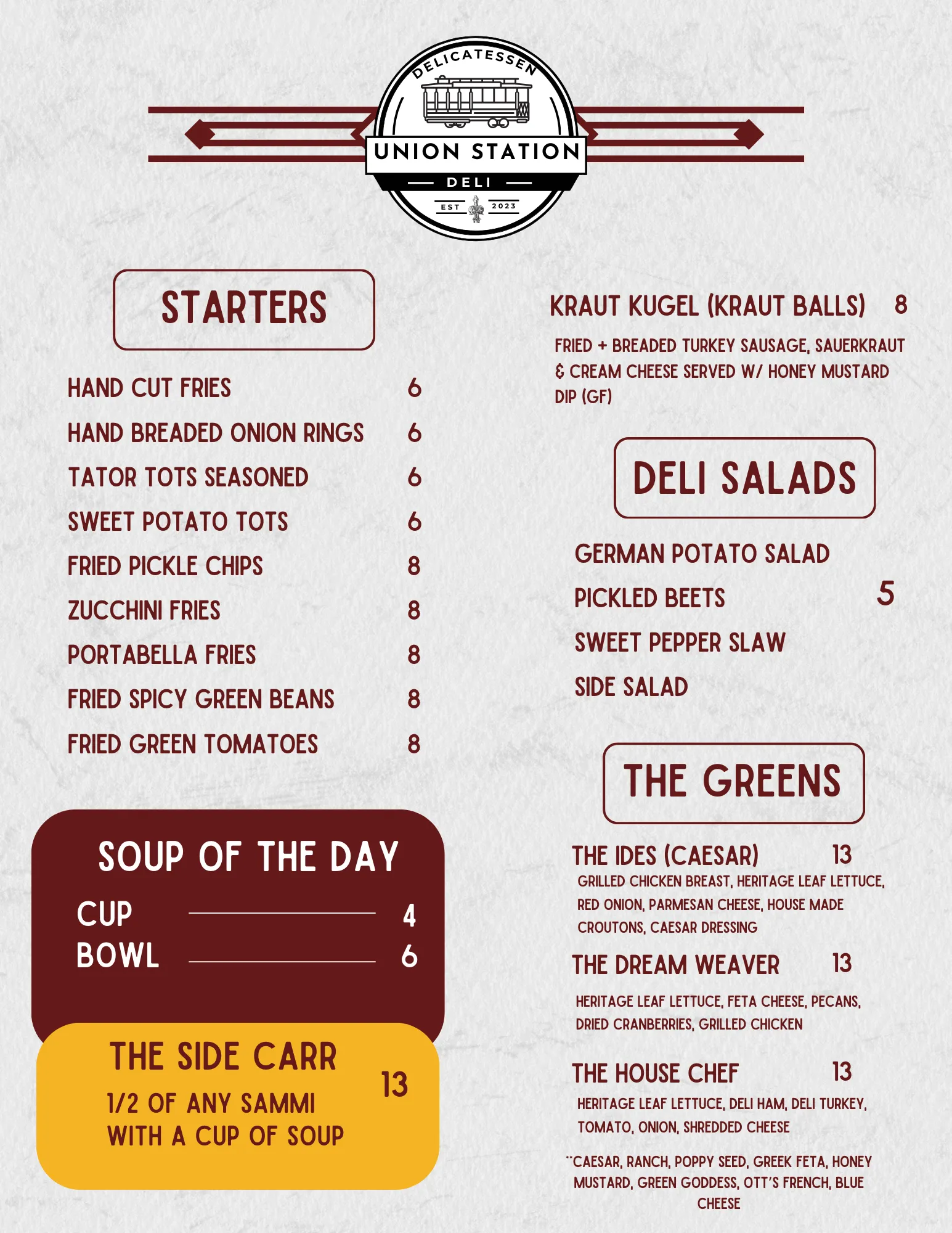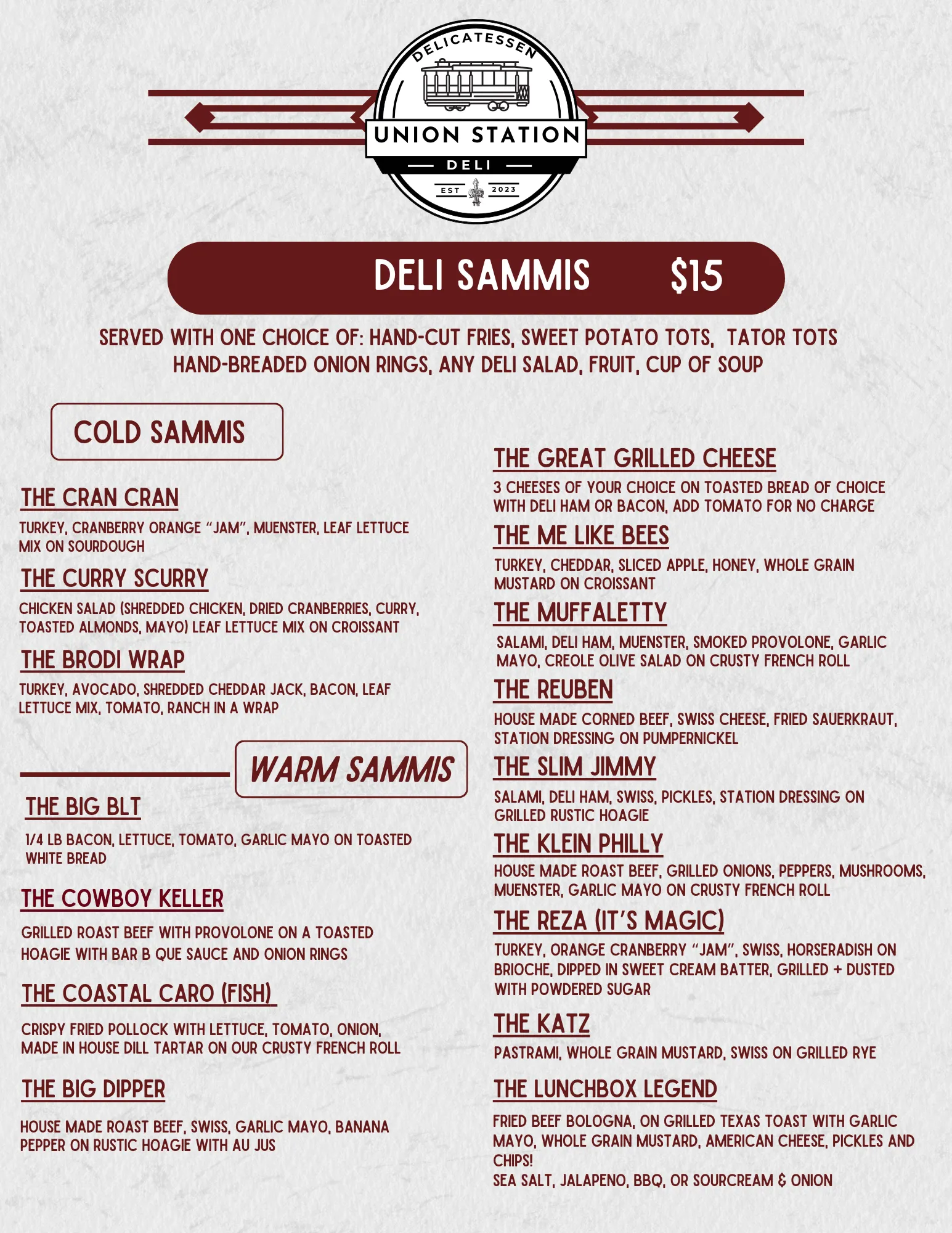 From classic sandwiches stacked high to freshly tossed salads and comforting soups, there’s something for everyone at Union Station Deli. Each bite is a celebration of home-style cooking and time-honored traditions that will leave you coming back for more.